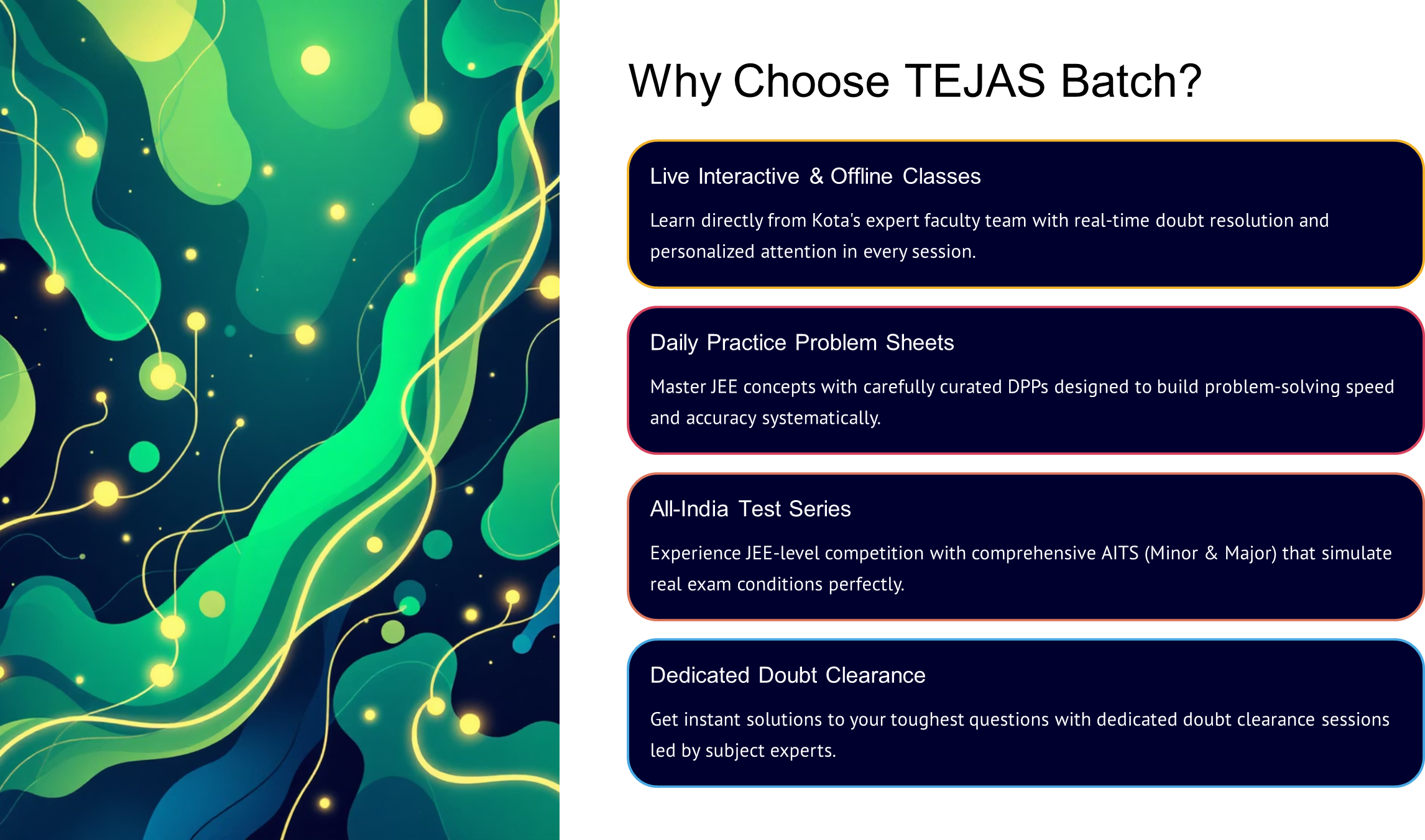 The Tejas Batch is a short-term, intensive 40-50 Days Crash Course for aspirants targeting JEE Main January 2026.